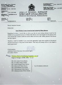 கிளிநொச்சி மாவட்டத்தில் மணல் அகழ்வதற்கான அனைத்து அனுமதி பத்திரங்களும் மறு அறிவித்தல் வரை இரத்து செய்யப்பட்டுள்ளதாகவும், இந்த அறிவித்தலை கிளிநொச்சி முல்லைத்தீவு பிராந்திய பிரதி காவல்துறை அதிபர் மற்றும் கிளிநொச்சி மாவட்டத்தின் அனைத்து காவல் நிலையங்களின் பொறுப்பதிகாரிகளுக்கும் அனுப்பி வைக்குமாறு மாவட்டச் செயலகத்திடம் தெரிவித்துள்ளதாகவும் மாவட்ட ஒருங்கிணைப்புக் குழுவின் தலைவர் மு.சந்திகுமார் தெரிவித்துள்ளார். இது தொடர்பில் மேலும் தெரியவருவதுதாவது,