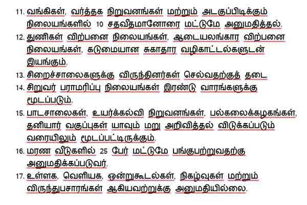 இந்த வழிகாட்டல்களுக்கு அமைவாக, பல்வேறான அம்சங்களுக்கு தடை விதிக்கப்பட்டுள்ளது. நேற்று (18) முதல் அமுலாக்கப்பட்ட இத்தடைகள், எதிர்வரும் 31 ஆம் திகதி வரையிலும் அமுலில் இருக்கும். அதன்பிரகாரம்