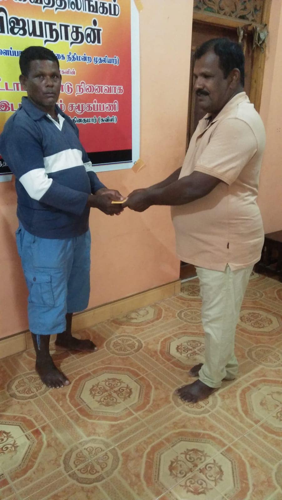 மட்டக்களப்பு சேற்றுக்குடாவைச் சேர்ந்த க.சுந்தரலிங்கம் மற்றும் மாவடிவேம்பைச் சேர்ந்த சீ.சங்கரப்பிள்ளை ஆகியோருக்கு தலா 30,000/ ரூபா வீதம் மொத்தம் 60,000/- ரூபா நிதி சுய தொழில் முயற்சியாக கோழிவளர்ப்பில் ஈடுபடுவதற்காக கட்சியின் மட்டக்களப்பு மாவட்ட அமைப்பாளர் ம.நிஸ்கானந்தராஜா தலைமையில் கட்சியின் சமுக மேம்பாட்டுப் பிரிவின் பொறுப்பாளர் ந.ராகவன், கட்சியின் மாவட்ட செயலாளர் கா.கமலநாதன் ஆகியோர் முன்னிலையில் வழங்கிவைக்கப்பட்டது.