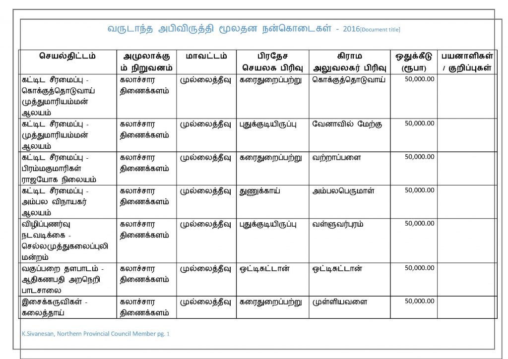 52 பொது அமைப்புக்களின் வளர்ச்சிக்காக மாகாணசபை உறுப்பினர் சித்தார்த்தன் நிதி ஒதுக்கீடு